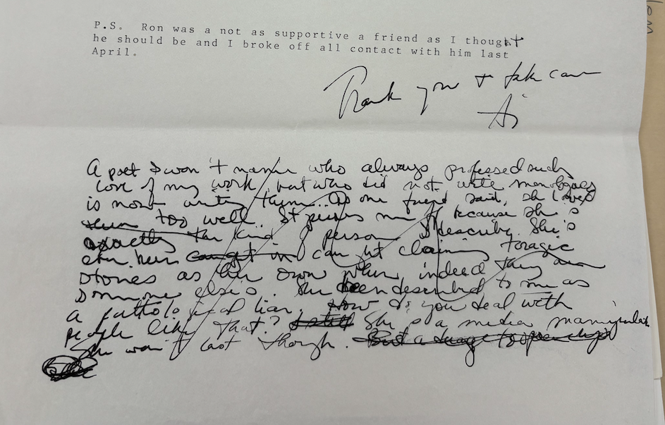 Ai’s correspondence with Dafoe also reveals her own vulnerabilities around the artist’s life. On the second page of the book dedication request letter, she asks Dafoe for advice on how to deal with opportunistic peers in one’s creative field: “A poet I won’t name who always professed such love of my work but who did not write monologues is now writing them…How do you deal with people like that? She’s a media manipulator. She won’t last though.” Parsing out this sentence also took some zooming in and handwriting study!