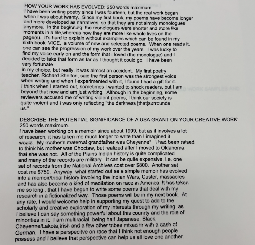 In this same grant application, Ai wrote that her reason for applying was to obtain funding for research she was conducting on her Native American ancestry. Her description of this project is a testament to how a writing endeavor can take much longer than the writer initially thought, and to how costly the archival research process can be: “I have been working on a memoir since about 1999, but as it involves a lot of research, it has taken me much longer to write than I imagined it would…All of the Plains Indian history is quite complicated…It can be quite expensive, i.e. one set of records from the National Archives cost over $800…what started out as a simple memoir has evolved into a memoir/tribal history…”