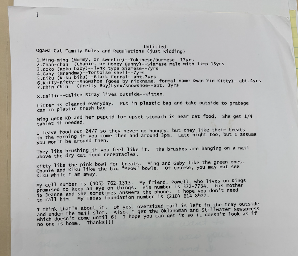 I honored the witchy proclivities that brought me to Ai’s work and began my journey into her papers with a folder about her cats. From saved vet bills to handwritten birthday cards to a condolence letter from neighbors upon one of her cats’ passing, Ai’s devotion to her feline companions was palpable. One set of instructions she typed up for a cat sitter was charmingly titled “Ogawa Cat Family Rules and Regulations (just kidding).” This document reveals that Ai had seven cats at one point, plus a stray she was feeding. She gave each of them distinctive names as well as nicknames.