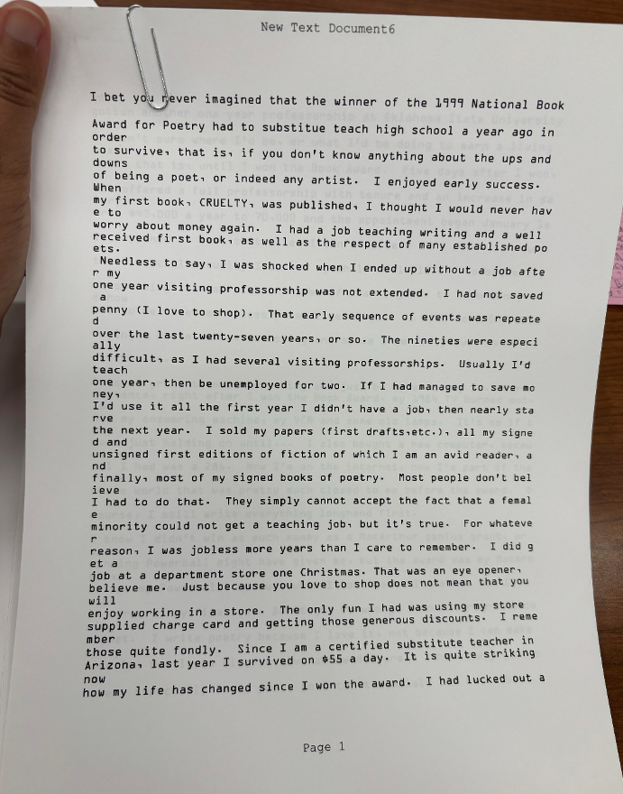 I did not expect to see any traces of Ai seeking out advice, but of course, support and mentorship are so crucial for artists trying to survive in competitive, underpaid fields. Indeed, Ai’s papers stand as a testament to the difficulty and instability of finding financial security as a poet. In a grant applications folder, there was a candid writeup where Ai states: “I bet you never imagined that the winner of the 1999 National Book Award for Poetry had to substitute teach high school a year ago in order to survive, that is, if you don’t know anything about the ups and downs of being a poet, or indeed any artist.” She goes on to detail how she also had to sell her papers, collection of fiction books, and her own poetry collections which she signed. It was poignant to encounter within Ai’s papers the explanation for why a chunk of them is missing.