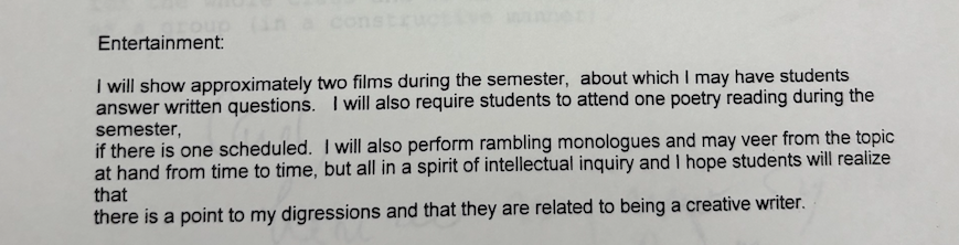 “During the semester, I may bring in poems and essays by outside writers to discuss and will expect You to participate in those discussions with enthusiasm, but I would hope you’d be Interested in sharing your thoughts, hopes, dreams, etc.”