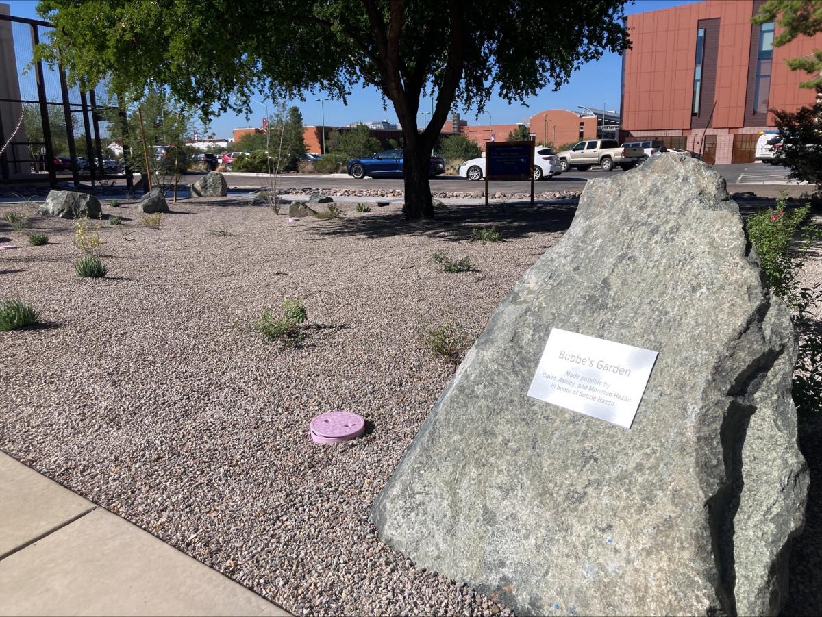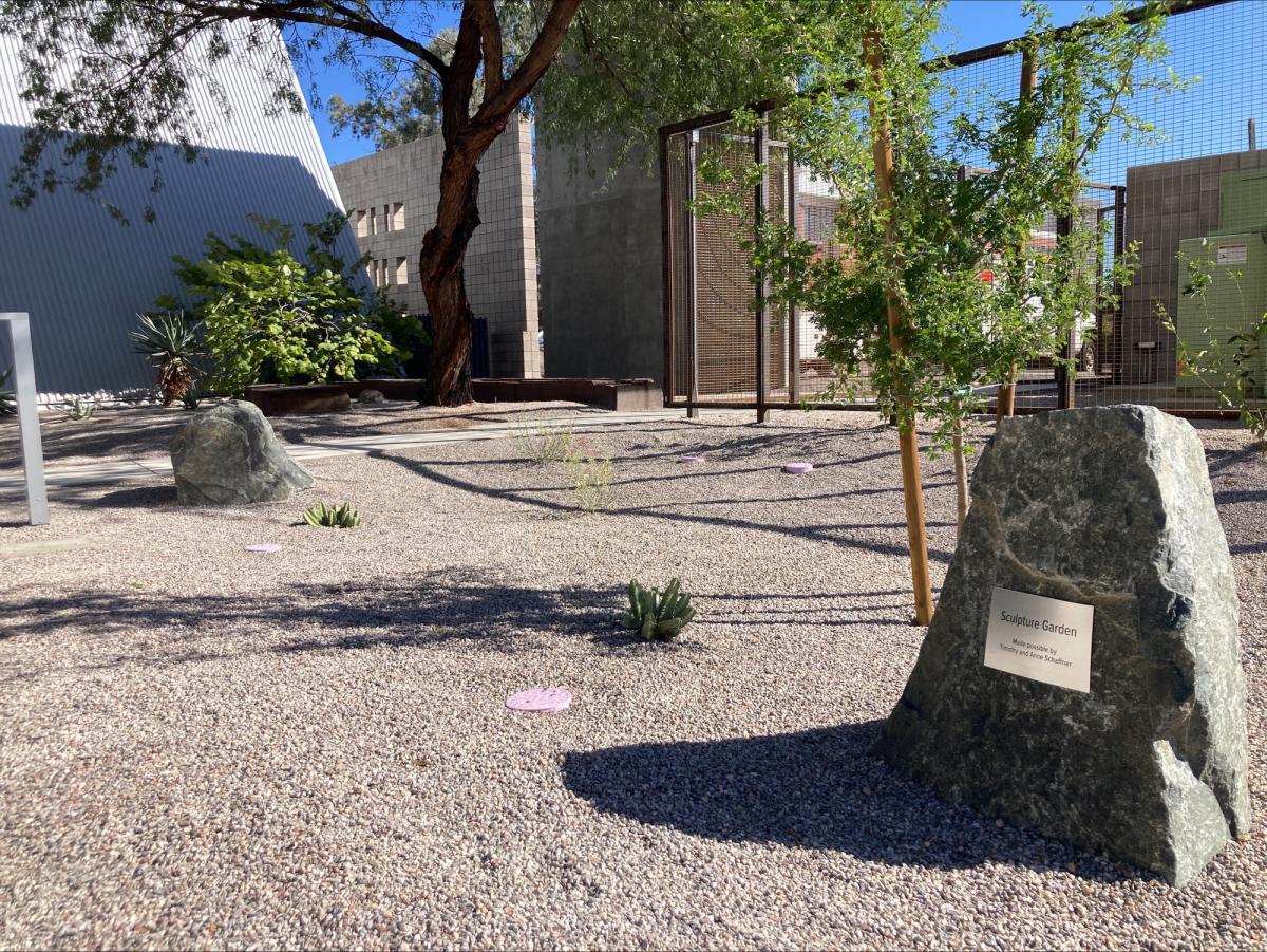 Native and desert-adapted plants are featured across five distinct garden areas and includes salvaged plants from the Tucson Succulent Society. Additionally, new trees have been included that over time will complement and add to the existing shade provided by two large mesquite trees. Designed for water retention, the garden areas had a recent test run with the significant rains of October 2025, and performed as hoped. The named garden areas include Bubbe's Garden, named with support from David, Ashley, and Morrison Hazan in honor of Soozie Hazan; the Apostrophe Garden, named with support from an anonymous donor, and the Sculpture Garden, named with support from Tim and Anne Schaffner. Over time, as plants establish roots and grow, they will fill in the space with significant and exciting greenery.