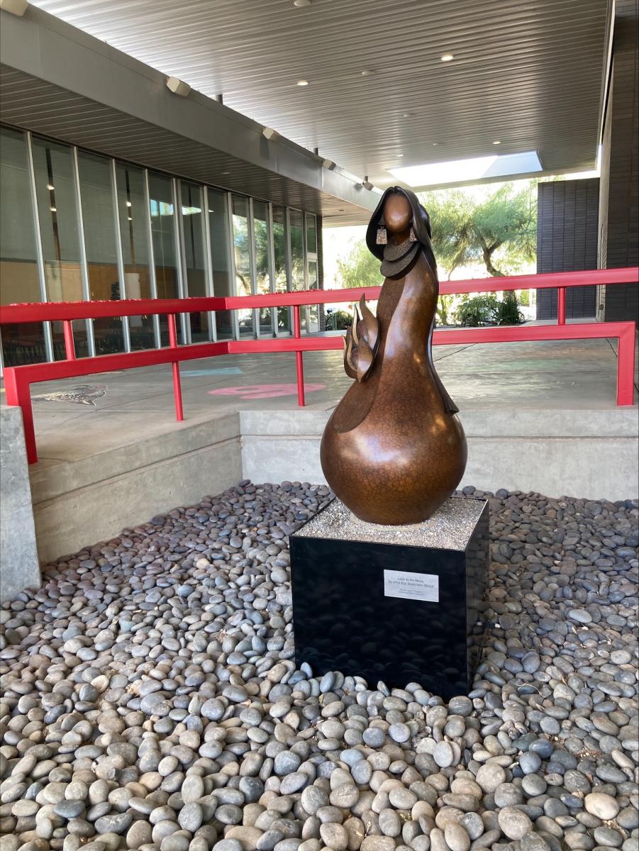 The re-envisioned garden area also inlcudes a new home for Look to the Mesa, a sculpture created by Hopi artist Kim Obrzut and gifted to the Poetry Center by former University of Arizona President John Schaefer in memory of his late wife Helen S. Schaefer, the namesame of our landmark facility. Look to the Mesa is positioned prominently at the entryway of the Poetry Center, to both welcome visitors in, while gazing out on the newly created space. You can learn more about the sculpture in this article from Arizona Alumni Magazine.